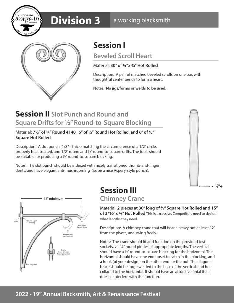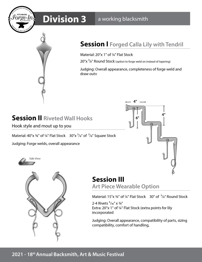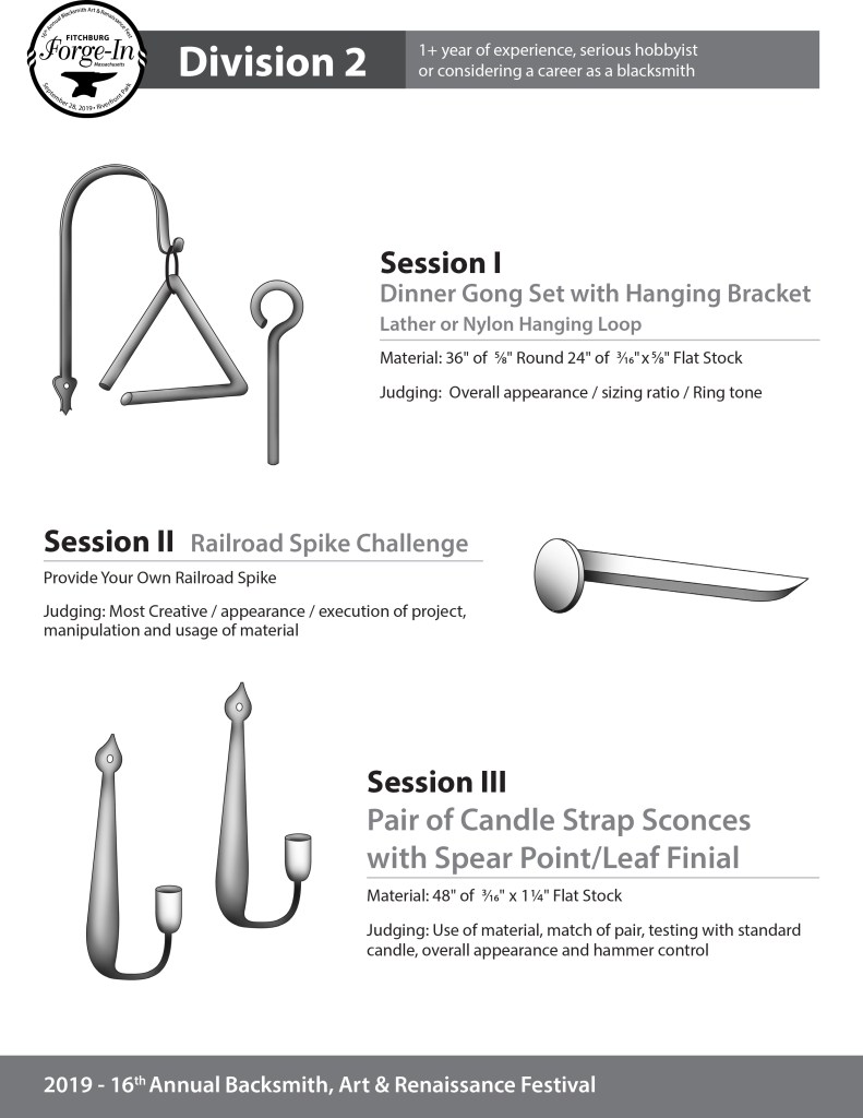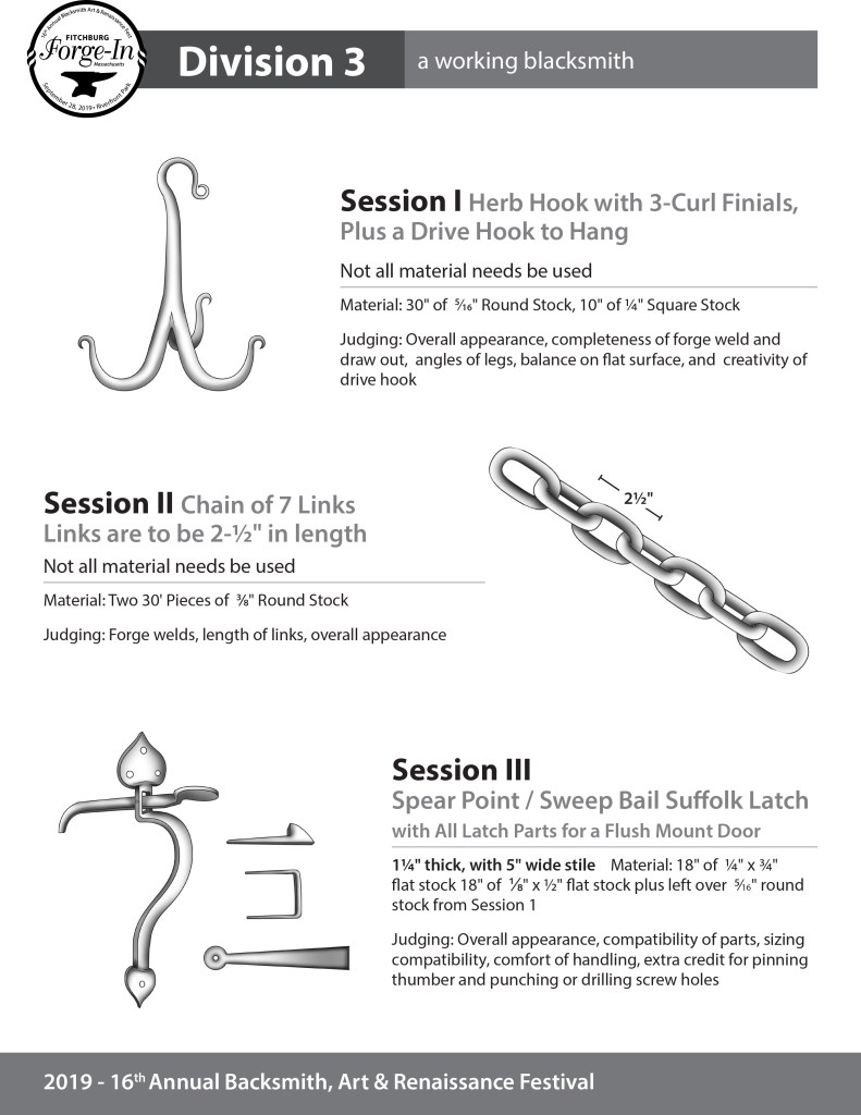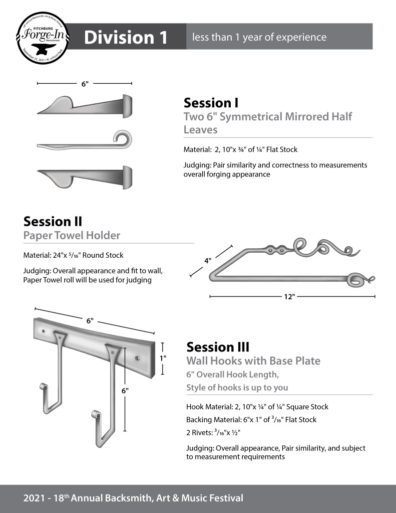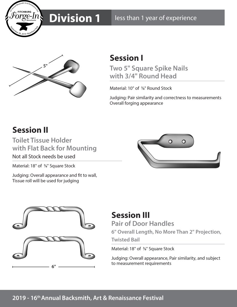 Division 1 is for entry-level blacksmiths or less than one year of experience. Division 2 is for serious hobbyists considering a career in blacksmithing or 1+ years of experience, and Division 3 is for a working blacksmith. Please choose the correct PDF that corresponds to your entry choice on your submitted blacksmith application.